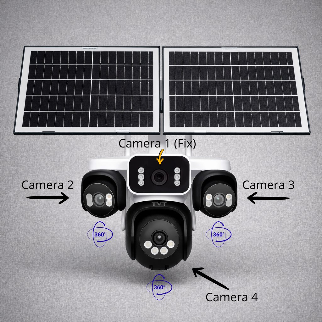 كاميرا مراقبة شمسية بـ4 عدسات مع لوحتين طاقة شمسية، رؤية ليلية بالألوان وكشف الحركة. مزودة بصوت في اتجاهين، مما يتيح لك السمع والتحدث مع الشخص الذي تراه مباشرة عبر الهاتف. تحكم كامل من أي مكان ومناسبة للمنازل والمحلات والضيعات